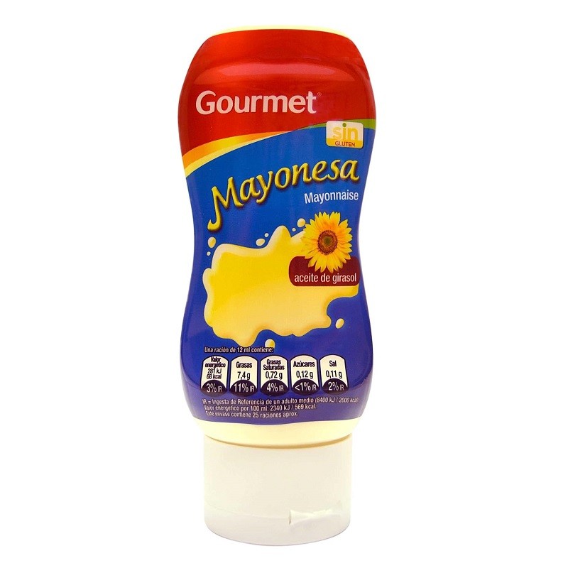 La mayonesa de Gourmet es un producto listo para usar. Tiene una textura fina y sabor agradable. Está elaborado con aceite de girasol y no contiene gluten. Se puede servir con bocadillos, aperitivos o ensaladas. Viene en un práctico envase fácil de dosificar.