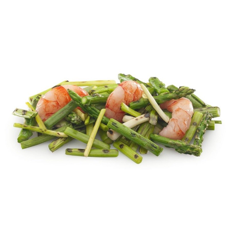 Revuelto de ajetes, espárragos trigueros y gamba.