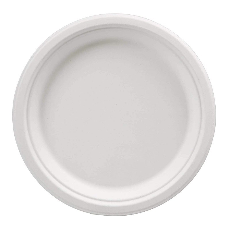 Paquete de 10 unidades. Plato de postre de celulosa de color blanco con borde azul. Medidas 17 cm.